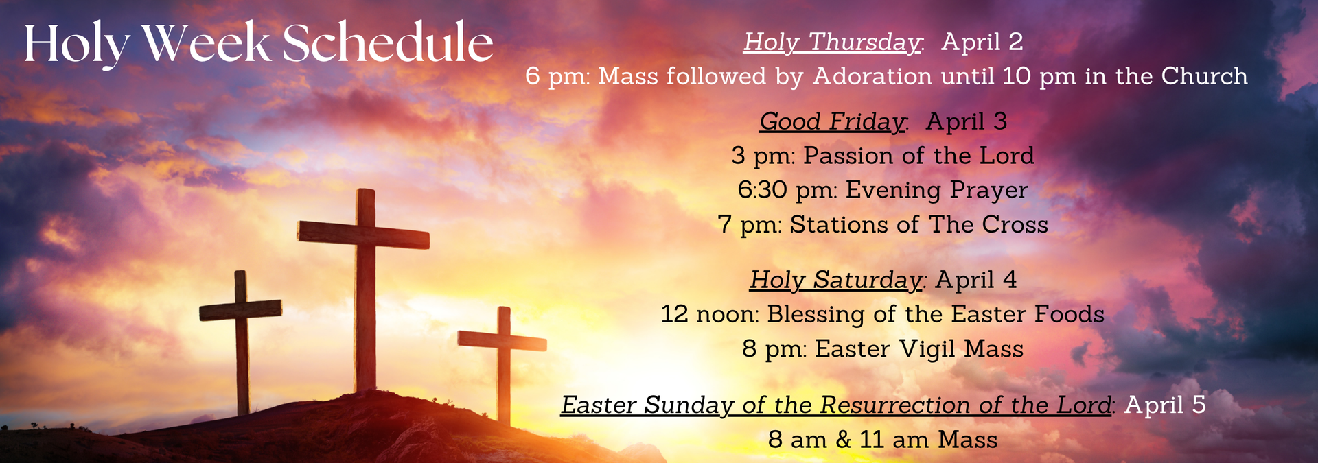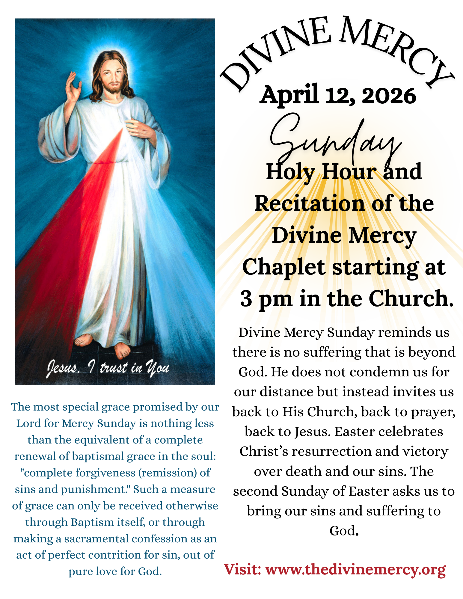 Daily Mass Schedule: In the Chapel behind the Church: Tues., Wed. & Thurs. at 8 am