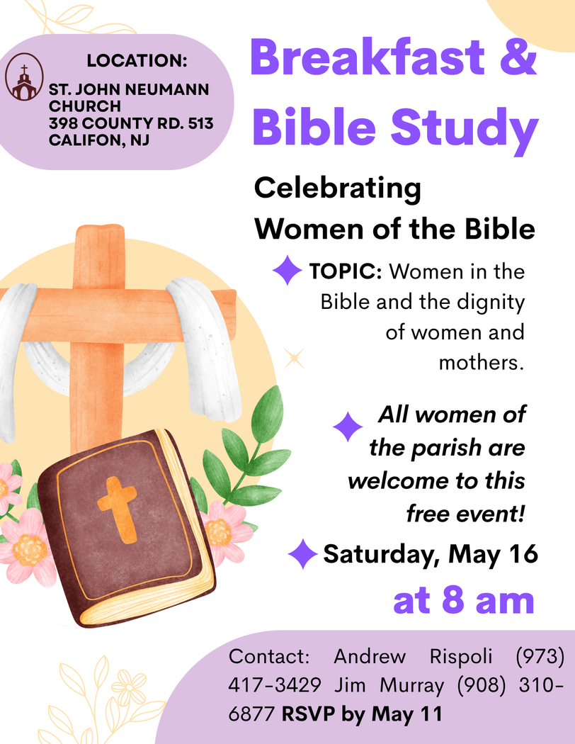 Interested in learning more about the Bible? Consider attending our Bible Study. Hosted by our parishioner, Andrew Rispoli, the Bible Study meets every Tuesday at 7:30 p.m., in the Church Hall.